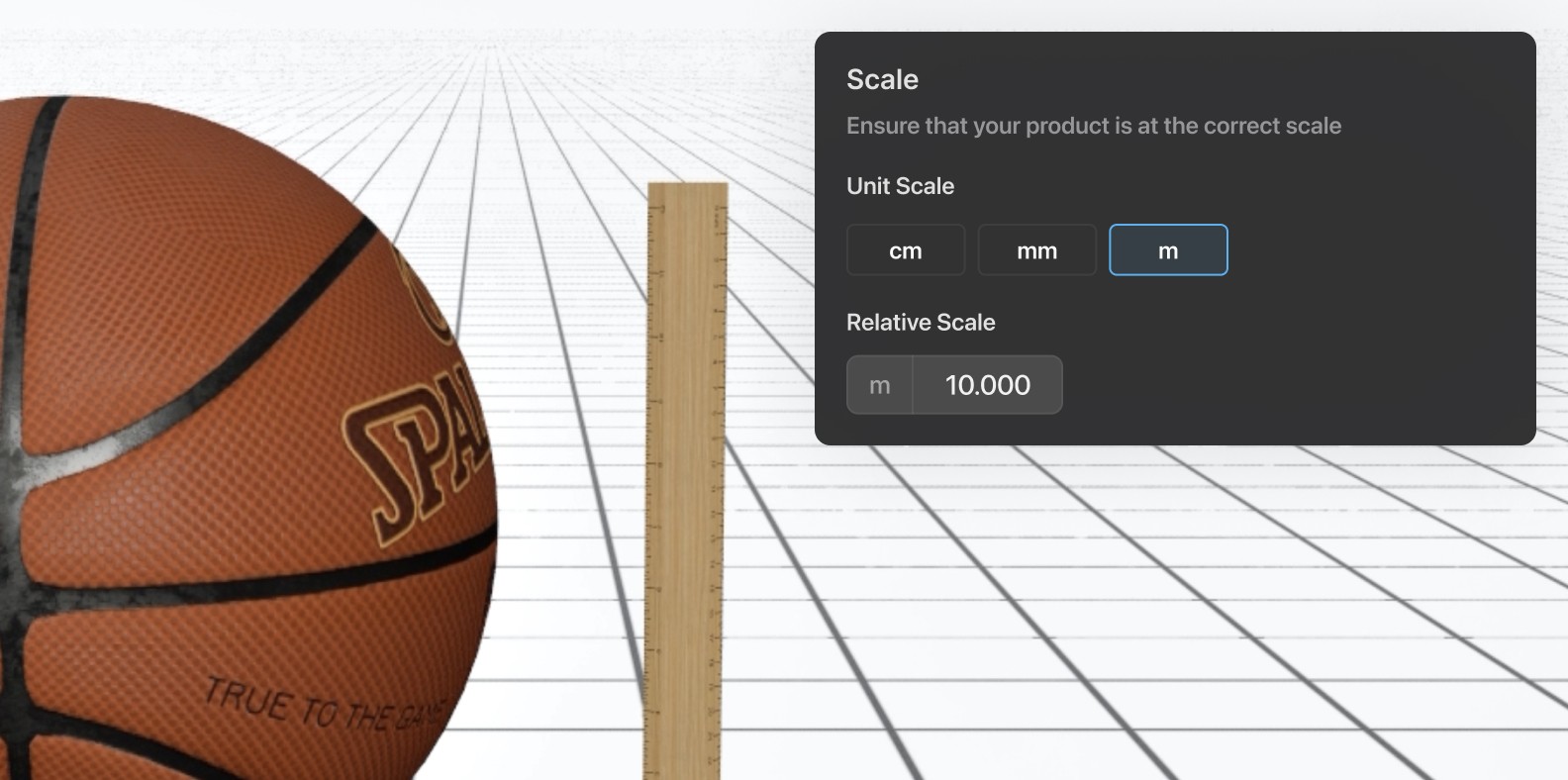 Example: If a basketball appears too small in your scene (perhaps the size of a quarter), first try changing the Unit Scale to meters. If it's still too small, adjust the Relative Scale - setting it to "10.0" might be appropriate. You can then fine-tune as needed.