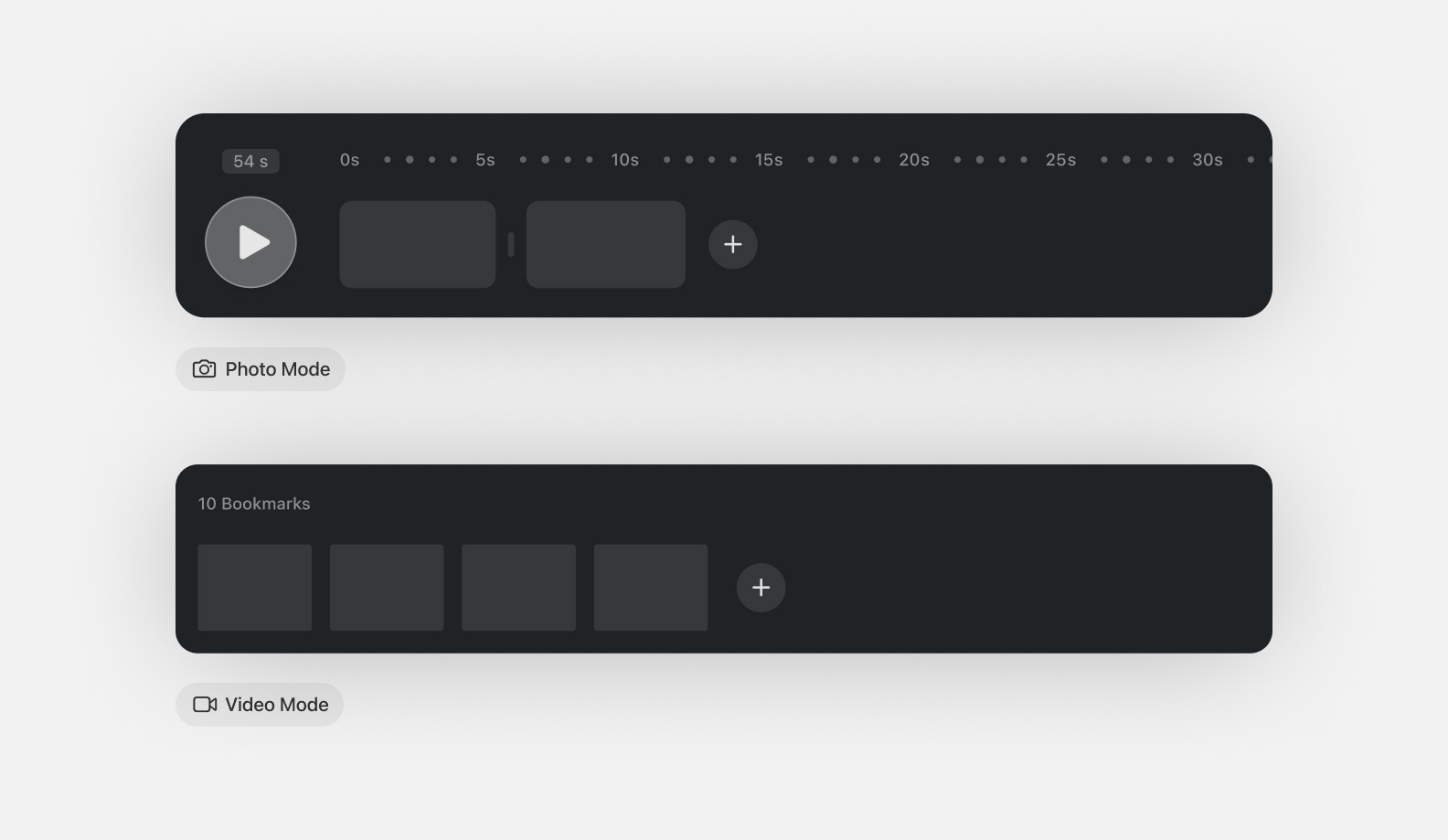 The shot panel manages each shot associated with a project. Depending on the selected mode, photo or video, the timeline bar will look slightly different. Regardless of mode, the timeline bar will describe each shot or camera movement.