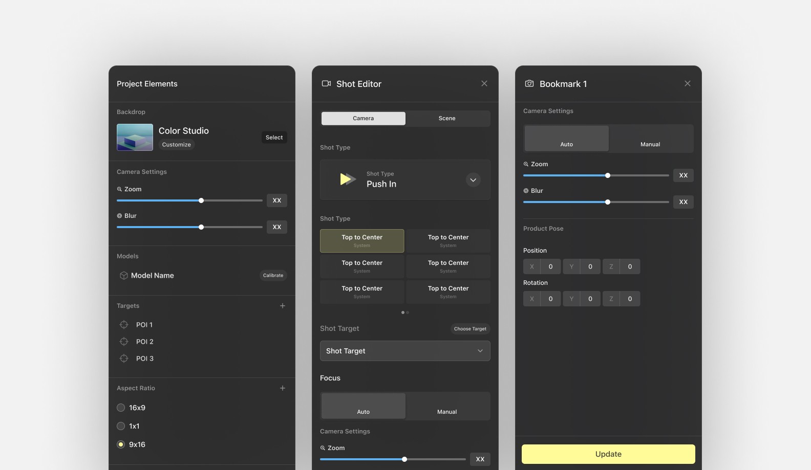 With a shot or backdrop selected, you can explore their properties. This will include properties like the shot type, camera zoom, camera position, and focus.