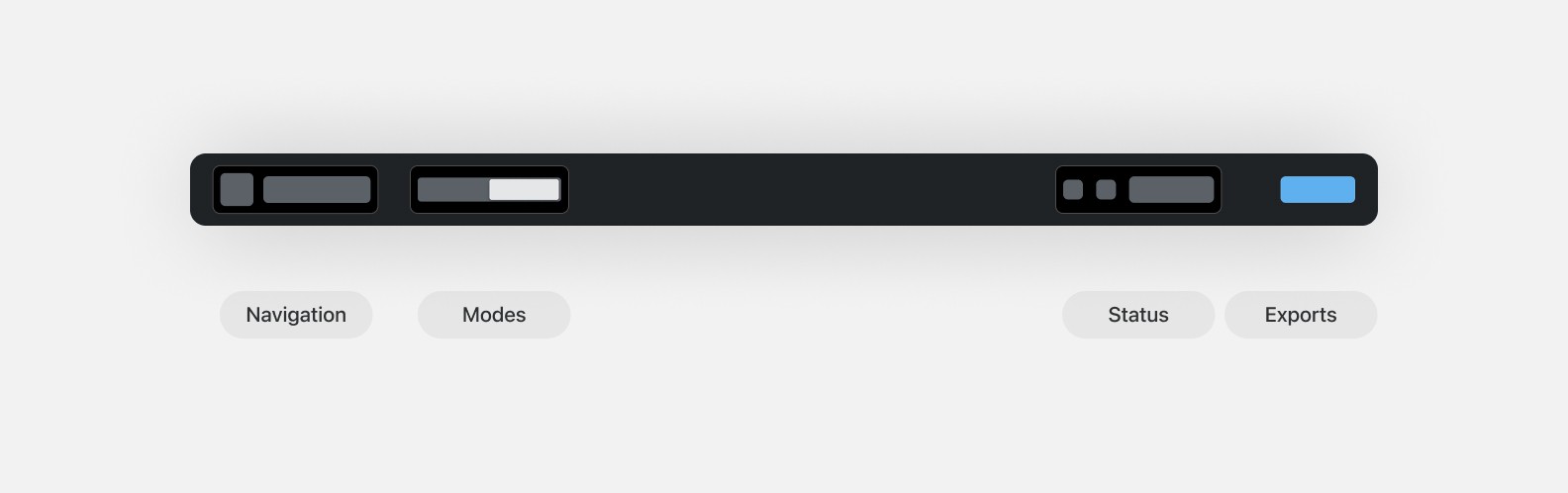 The toolbar contains a selection of important tools and actions. There are four groups: Navigation, Modes, Status, and Exports.