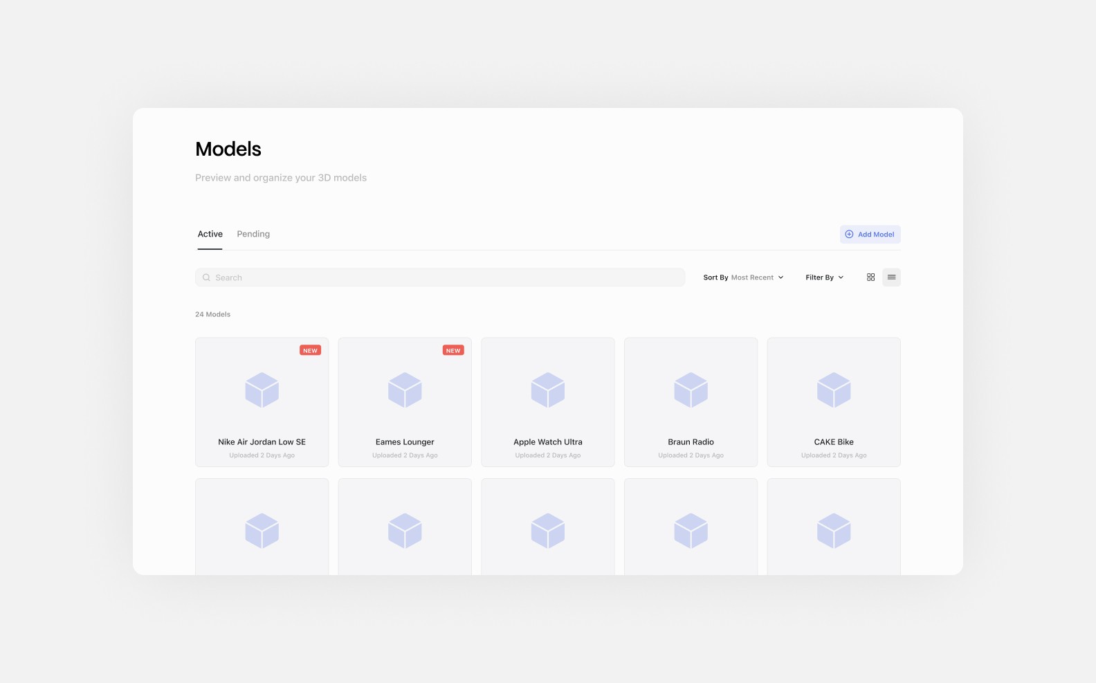 You can upload models directly using the Add model button at the top right or through the Add Model button in the model list. You can access and manage your 3D models from the Models page, accessible via the toolbar.